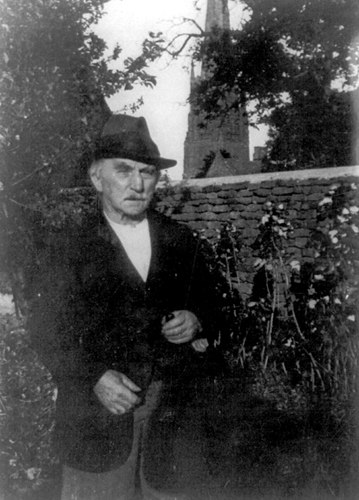 George WOODWARD in his garden in Tank Lane, Bloxham. St Mary's Church is in the background.