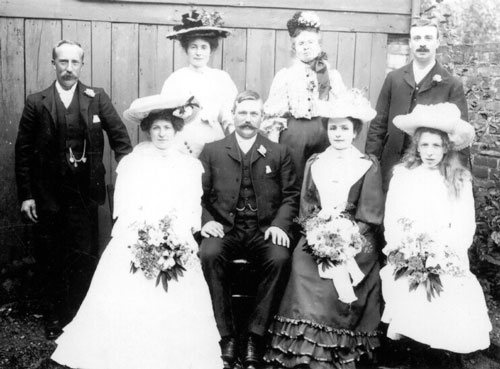 Wedding of Lydia Zillah CROZIER to John Hughes FRENCH, June 1906. Harriet Sophia CROZIER, née COX, is second from right in back row.