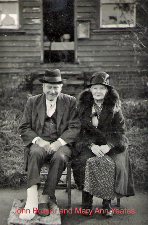 Mary Ann BOWLER, née YEATES, with her husband John BOWLER. The photograph is believed to have been taken to celebrate their 60th wedding anniversary in November 1937. John suffered from gout, hence the foot bandage.