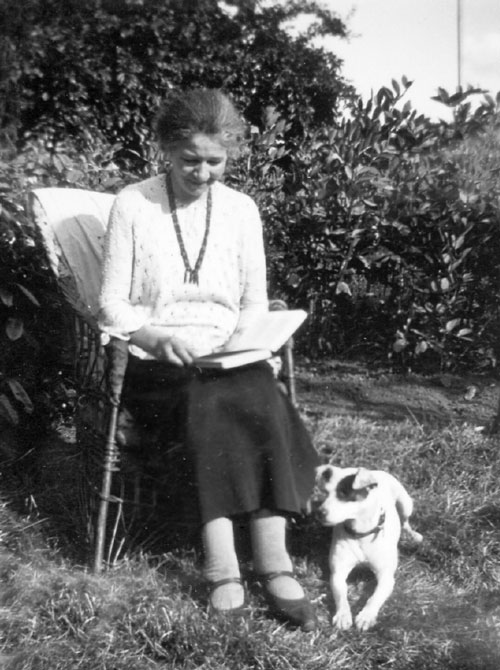 Minnie RACKSTRAW, née HOLLAND at home in Over Worton with dog, Sue.